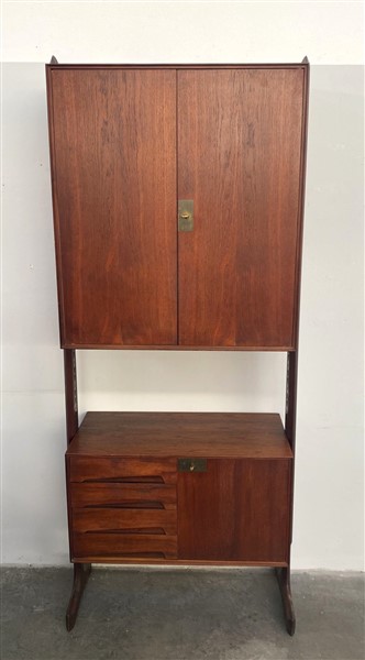 Libreria modulare in legno massello e impiallacciato con parte inferiore con sportello e quattro cassetti, parte supeiore a due sportelli. Produzione Dassi, Italia, anni '50. (cm 80x200x41)
