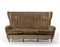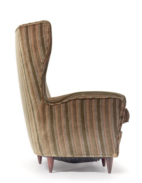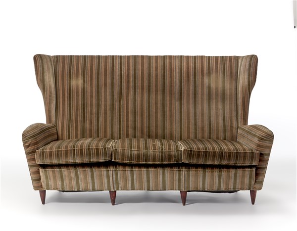 Divano a tre posti con struttura in legno, rivestimento in velluto a righe verdi e rosa, piedini troncoconici. Italia, anni '50/'60. (cm 187x110x74) (difetti)