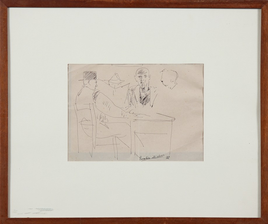 VELLANI MARCHI MARIO (1895 - 1979) Pescatori all' osteria. China su carta. Cm 25,00 x 18,00. Sigla e titolo in basso a destra. Cornice presente