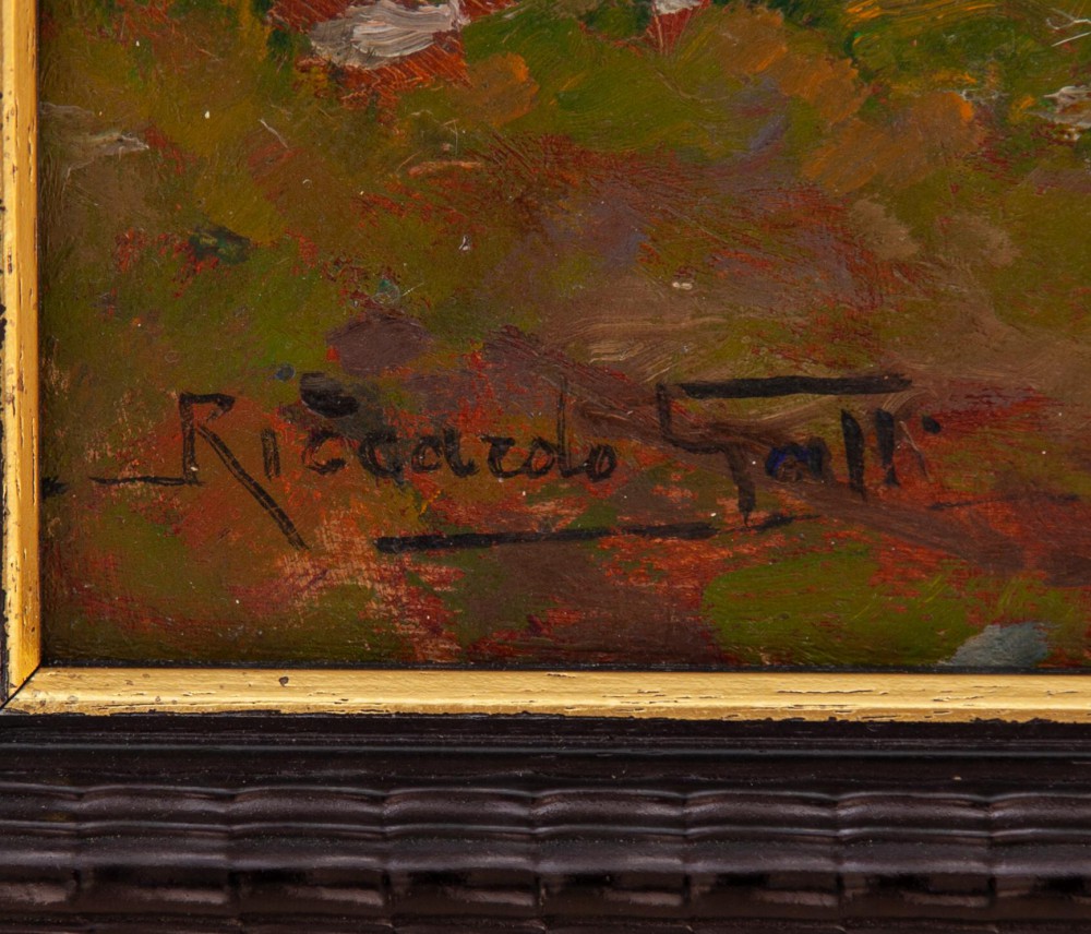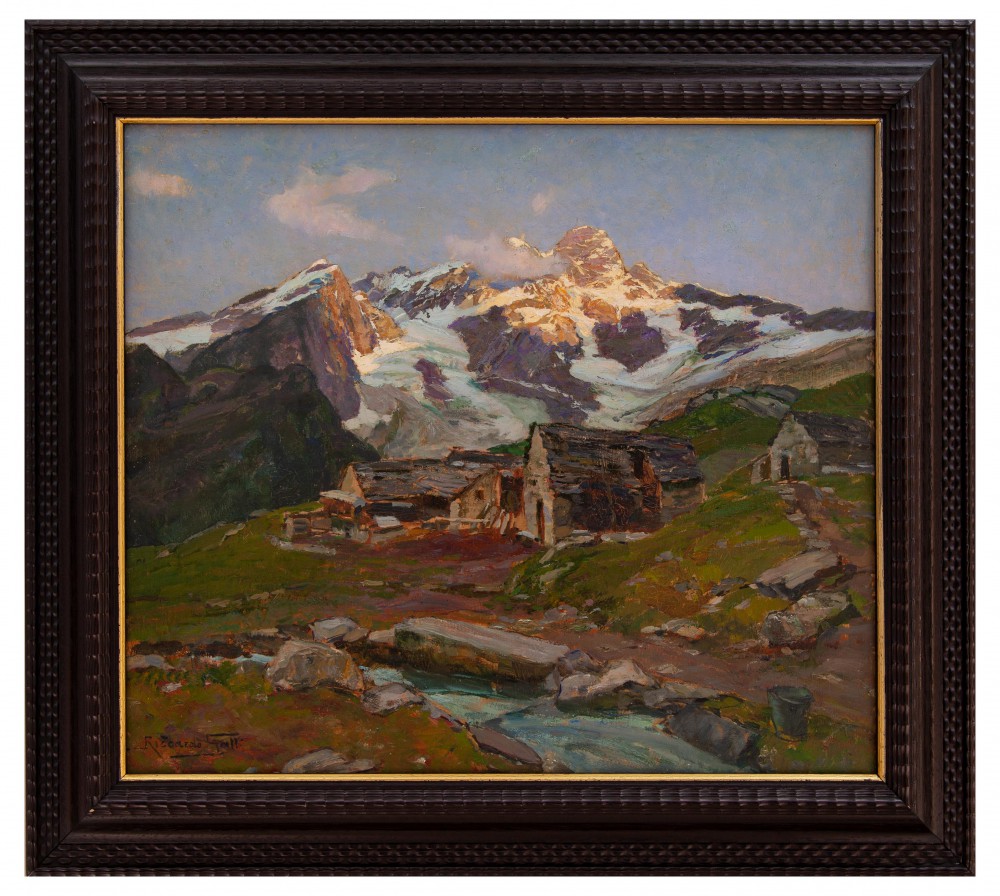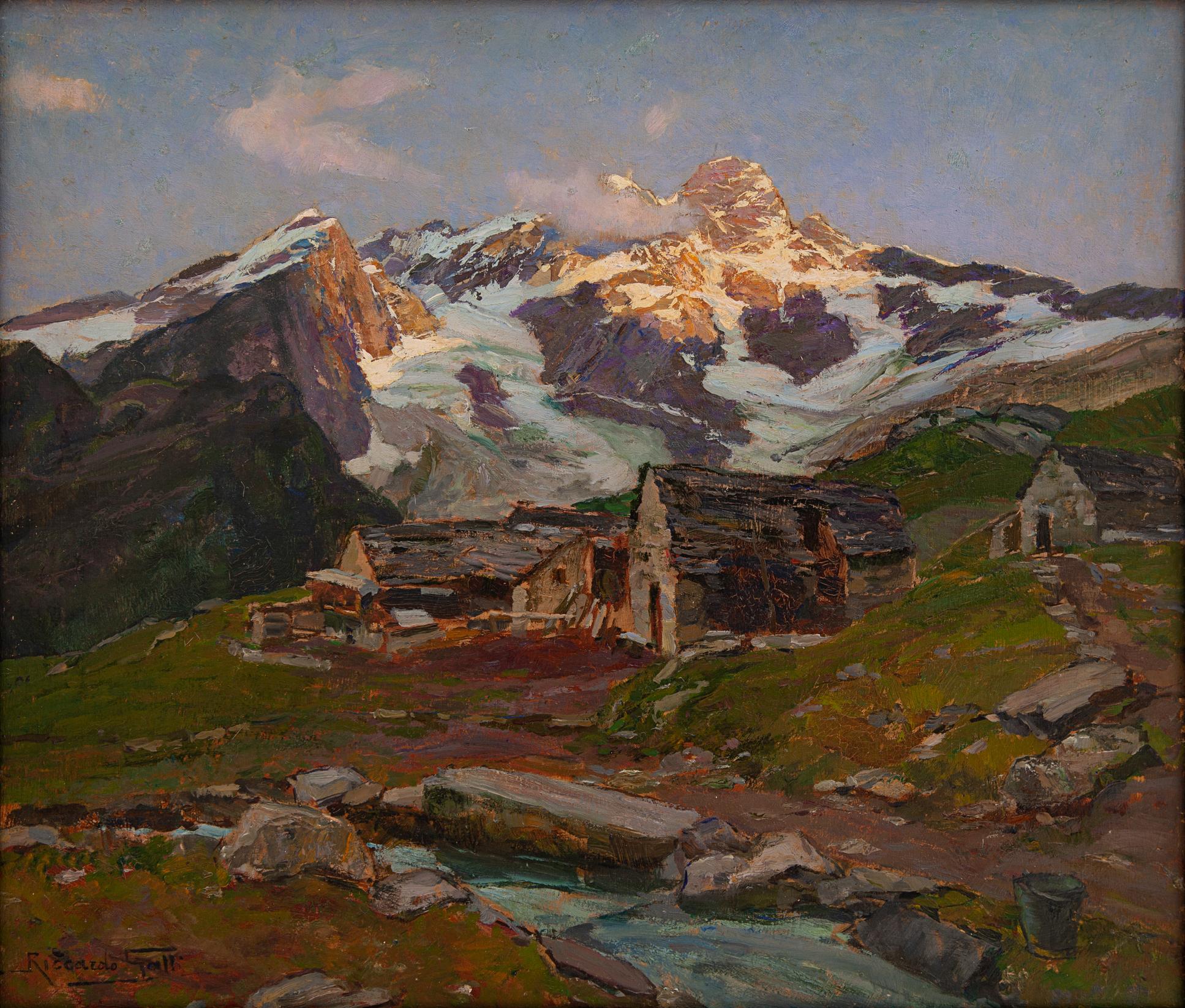 Riccardo Galli Milano 1869 - Barzio (LC) 1944 Casolari in alta montagna Olio su tavola cm 50x60.