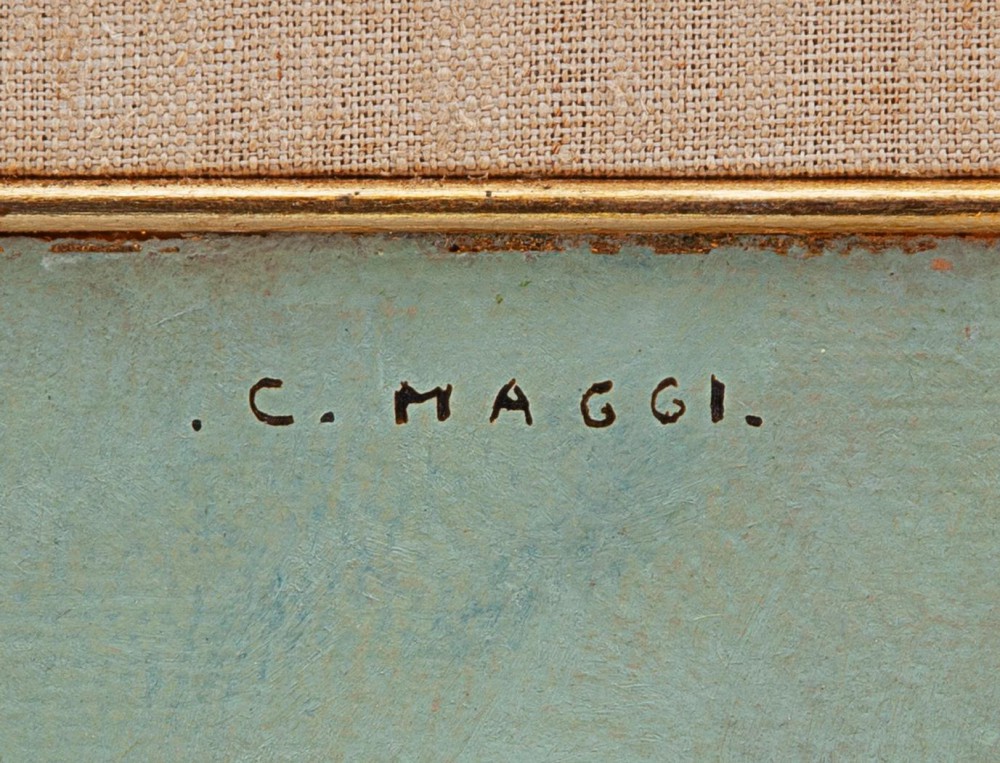 Nacque a Roma il 13 gennaio 1881 durante una tourneé dei suoi genitori, Andrea e Pia Marchi, attori nella compagnia Bellotti-Bon. Venne indirizzato agli studi classici, che svolsero tra Firenze e Lucca; ma all’età di sedici anni iniziò la sua formazione artistica presso lo studio di Vittorio Corcos a Firenze e, nel 1897, presso quello di Gaetano Esposito a Napoli. Nel 1898 avvenne il suo esordio pubblico in occasione della LII Esposizione annuale della Società di belle arti di Firenze con i dipinti Occasi di novembre mesti (Carducci) e Almeno c’è il fuoco, acquistato da un privato. Nello stesso anno si recò a Parigi, dove frequentò l’accademia del pittore Fernand Cormon. Rientrato in Italia, nel 1899 assistette alla mostra commemorativa in onore di Giovanni Segantini al palazzo della Società di belle arti di Milano, che fu una vera rivelazione per il M., affascinato dalla luce della pittura segantiniana, al punto da volerne carpire la tecnica in loco. Per questo motivo si trasferì, nello stesso 1899, nell’Engadina, dove già Segantini aveva lavorato in completo isolamento. Il soggiorno però si interruppe bruscamente nell’aprile del 1900, per la morte, a Roma, della madre. Dopo un breve periodo a Torino, il M. riprese le sue sperimentazioni dal vero a Forno Alpi Graie, in provincia di Torino. Sempre nel 1900 a Milano stipulò un contratto in esclusiva con il mercante Alberto Grubicy, che sancì la sua piena appartenenza al gruppo divisionista. L’anno seguente conobbe Giacomo Grosso, che lo introdusse al Circolo degli artisti e alla Promotrice delle belle arti di Torino. Sempre nel 1901 prese parte alla XLIII Esposizione della Società di incoraggiamento alle belle arti al Circolo degli artisti di Torino. L’anno successivo ottenne la sua prima personale al palazzo della Società di belle arti di Milano, nell’ambito della rassegna di pittori divisionisti organizzata da Grubicy. In questa occasione presentò solo dipinti di soggetto montano, dando avvio a quella fama di “pittore della montagna”, alla cui elaborazione contribuì l’abilità commerciale e promozionale di Grubicy, che pesò notevolmente sul giudizio della critica anche dopo la fine della stagione divisionista e del rapporto del Maggi con il mercante, nel 1913. Il contratto con Grubicy gli imponeva una produzione a ritmo serrato di dipinti. Tale condizione determinò una sorta di discrimine all’interno della sua produzione tra le opere destinate al pubblico, di buona fattura ma di scarsa ricerca, e quelle destinate alle esposizioni ufficiali, in cui tentò di innovare in senso personale il linguaggio divisionista. Nel 1904, dopo aver sposato Anna Oxilia, dalla quale ebbe due figlie, Giovanna e Pia, si trasferì nella località montana La Thuile, in Val d’Aosta, per approfondire lo studio dal vero. Nel 1905 presentò il dipinto Mattino di festa alla Esposizione internazionale di Venezia, acquistato dalla New South Wales Gallery di Sidney e successivamente intitolato Val d’Aosta. Italia. Nel 1907 esordì in ambito internazionale al Salon des peintres divisionnistes italiens a Parigi e fu invitato a partecipare all’Esposizione internazionale di Venezia, evento che segnò un momento importante nella sua carriera. Gran parte della critica colse la maturità ormai acquisita; una delle sue opere esposte, La prima neve, fu contesa da due prestigiosi musei, il Civico Museo Revoltella di Trieste e la Galleria nazionale d’arte moderna di Roma, che acquistò infine il dipinto. Si aprì così per il Maggi un periodo particolarmente felice, ricco di partecipazioni e riconoscimenti in importanti rassegne italiane ed estere. Nel 1908 fu presente alla V Esposizione d’arte italiana, itinerante in America meridionale; l’anno seguente si aggiudicò la medaglia d’oro di seconda classe alla X Internationale Kunstausstellung al Glaspalast di Monaco di Baviera. Sempre nel 1909 partecipò alla LXXIX Esposizione internazionale della Società amatori e cultori di belle arti di Roma e alla VIII Esposizione internazionale della città di Venezia, cui partecipò anche nel 1910. Alla Esposizione internazionale di Roma del 1911 presentò L’ultimo pascolo. La sala personale alla X Esposizione internazionale della città di Venezia del 1912 segnò una nuova svolta nella sua carriera. Per un anno l’artista concentrò gli sforzi su questo evento, che gli offriva l’occasione di riscattarsi dal marchio di “pittore della montagna” e nel contempo di mostrare il suo progressivo allontanamento dai modi divisionisti. In questa circostanza espose, infatti, oltre a opere di soggetto montano, anche una marina, Il mare, e quattro ritratti. La critica, polemica con l’istituzione per l’elevato numero di sale personali, non fu particolarmente benevola con lui. Ottenne, però, il favore del pubblico, favore confermato anche in ambito internazionale in occasione della personale alla galleria d’arte Gerbrands, ad Amsterdam, nel 1913, che gli valse numerose committenze. Sempre nel 1913 il M. lasciò La Thuile per stabilirsi definitivamente a Torino e per chiudere così la sua stagione di sperimentazione divisionista. Tuttavia, alla Biennale di Venezia del 1914, presentò ancora, accanto a opere come il Ritratto della contessa Olga Stenbock Fermor, vicino alla maniera di Grosso, un’opera di matrice segantiniana come Serenità (poi titolata L’ombra. La chiamata alle armi, nel luglio del 1915, non comportò l’interruzione della sua ricerca. Anzi, sia in montagna (con il 3 reggimento alpini) sia in mare (venne nominato commissario di bordo e imbarcato anche per rotte internazionali) ebbe modo di perfezionare il suo stile; e la sua pennellata divenne più ampia e distesa, soprattutto nelle marine. Congedato nel 1919, tornò a Torino. L’anno successivo fu nuovamente alla Biennale di Venezia, dove espose prevalentemente ritratti. La sua attività espositiva riprese intensa e foriera di nuovi successi, come l’acquisto