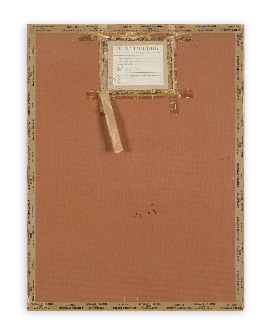 Etichetta e timbro della Galleria d'Arte Bottoni (TO) al retro del cartone protettivo