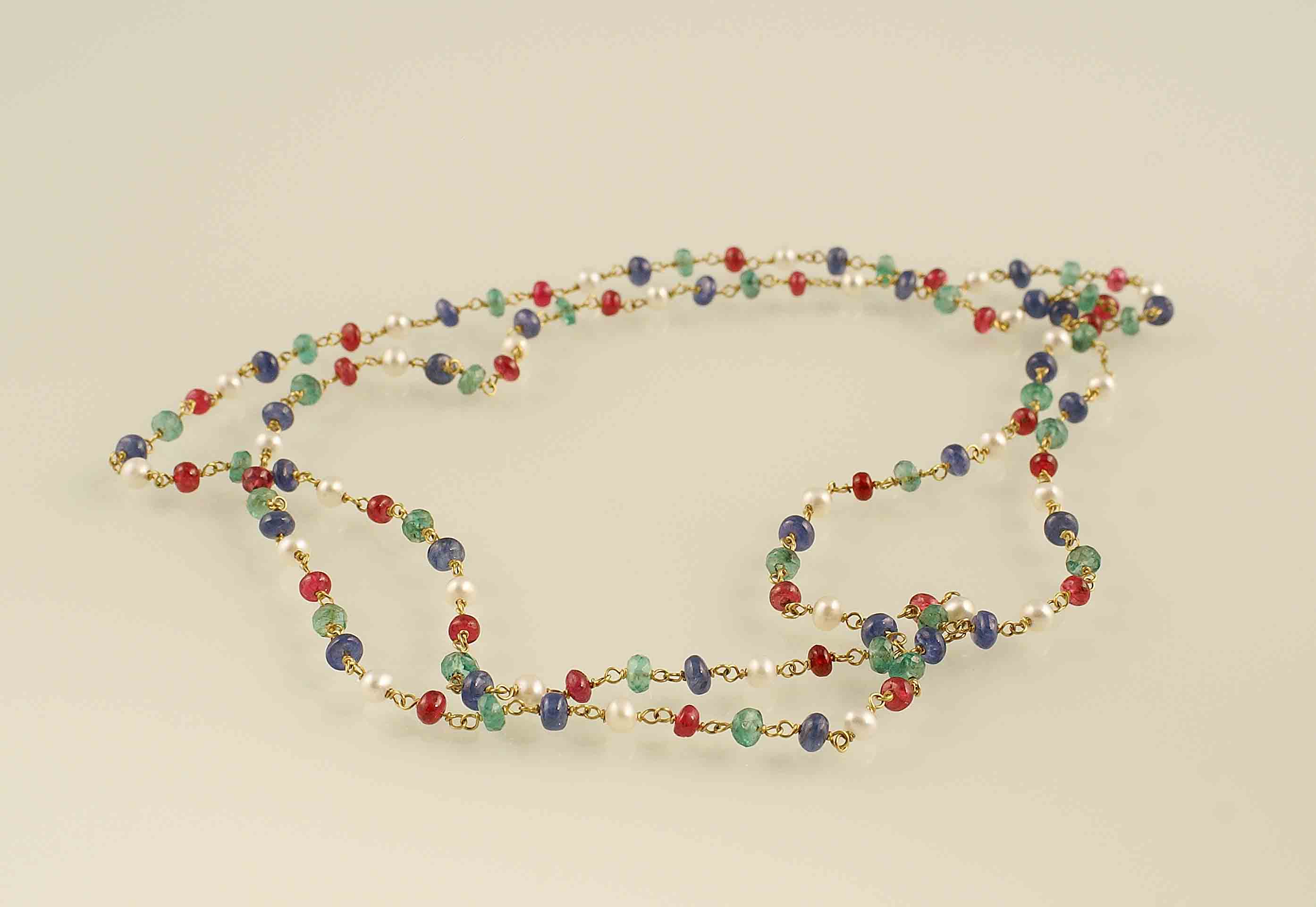 Collana in oro giallo 18kt con zaffiri, smeraldi e rubini taglio briolet alternati a perline, gr. 7,7.