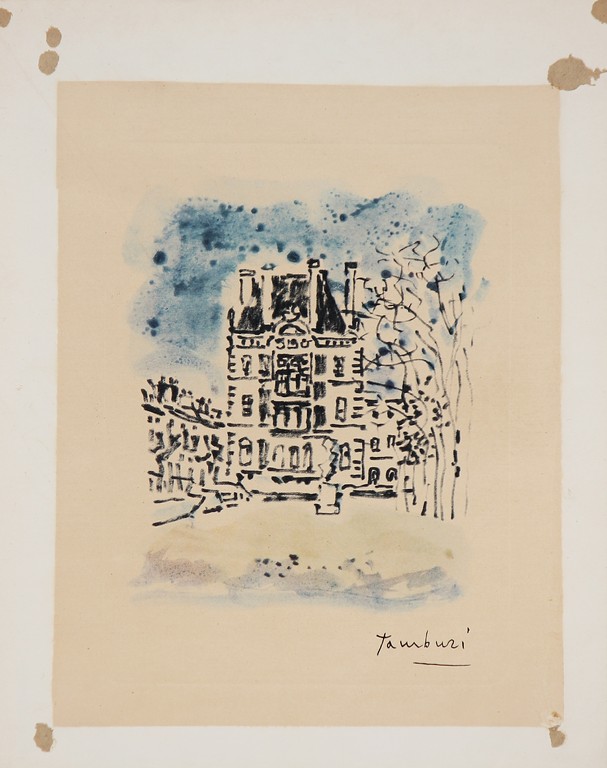 TAMBURI ORFEO (1910 - 1994) Paesaggio. Puntasecca acquerellata. Cm 22,50 x 28,50. Misure lastra: 20x15cm. Firma in basso a destra.