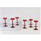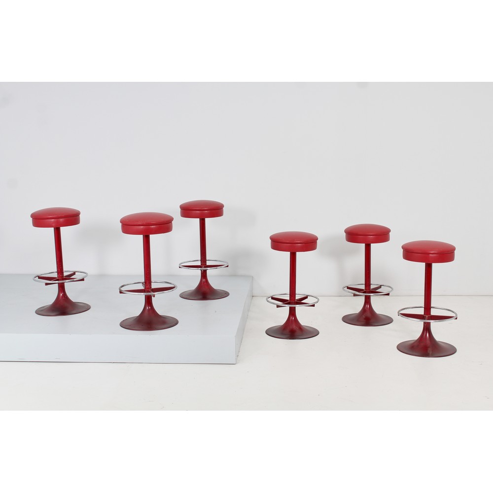 Sei sgabelli alti in metallo verniciato nei toni del rosso, base circolare con poggiapiedi i metallo cromato seduta circolare imbottita e rivestita con skai rosso. Difetti.