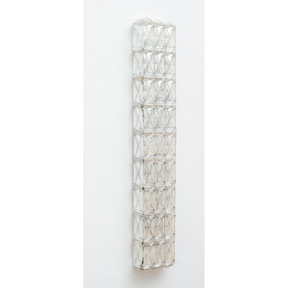 Lampada da soffitto/da parete a nove luci, corpo geometrico con struttura in metallo cromato e diffusore formato da numerosi cristalli trasparenti diamantati a taglio rettangolare. Rotture.
