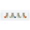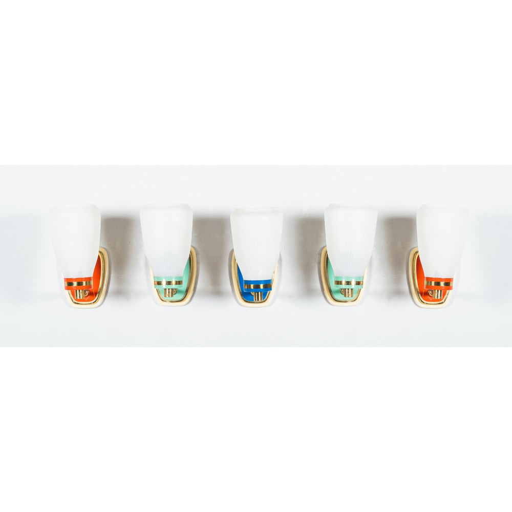 Cinque lampade da parete ad una luce, struttura in metallo verniciato con inserti in metallo dorato, diffusore a tulipano in vetro satinato e decorato con motivi geometrici in trasparenza. Due nei toni arancione, due del verde e uno blu.