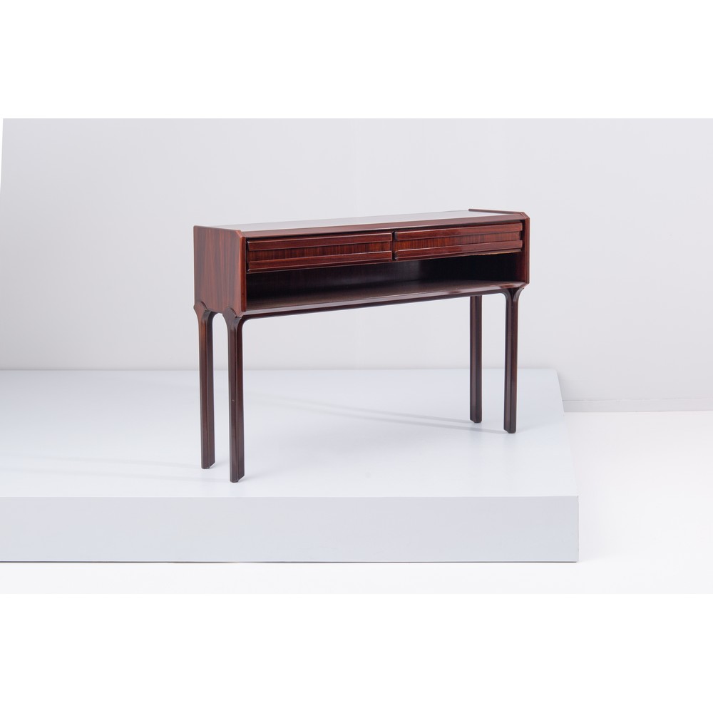 Consolle in legno, piano rettangolare, sul fronte due cassetti ed un vano a giorno.