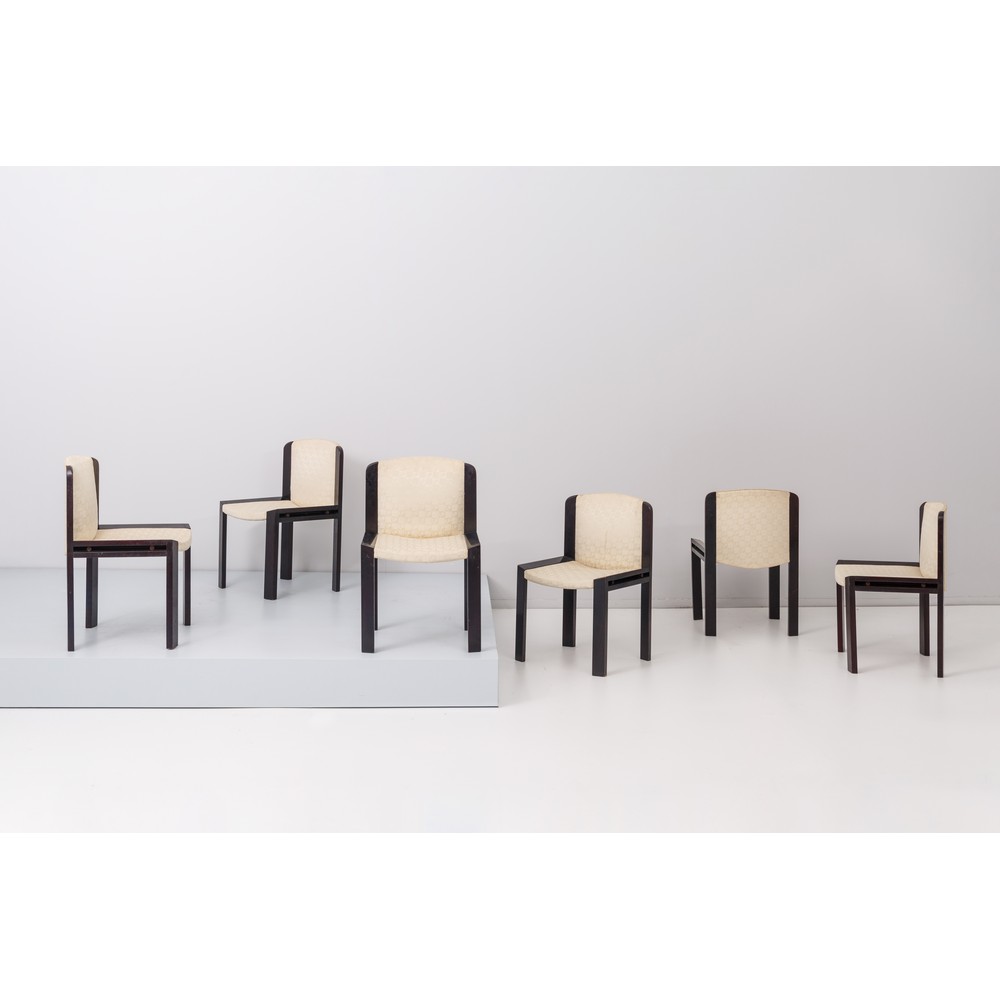 Sei sedie modello "300" in legno ebanizzato, spalliera e seduta rivestite in tessuto crema, segni di usura.