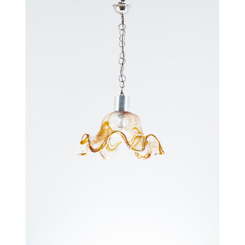 Lampada a sospensione ad una luce, struttura in metallo cromato, diffusore in vetro trasparente decorato con linee ambre, corpo a campana con bordo ondulato.