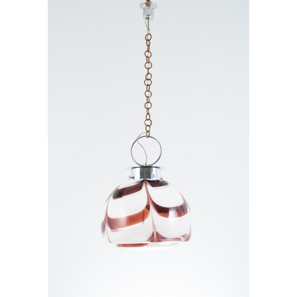 Lampada a sospensione ad una luce, struttura in metallo cromato con diffusore sferico in vetro lattimo con orlature seppia e trasparenti.