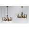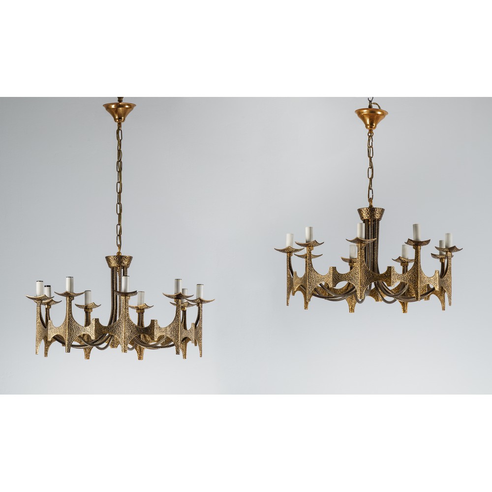 Coppia di lampade a sospensione a nove luci modello ‘Brutalist’ in ottone martellato.