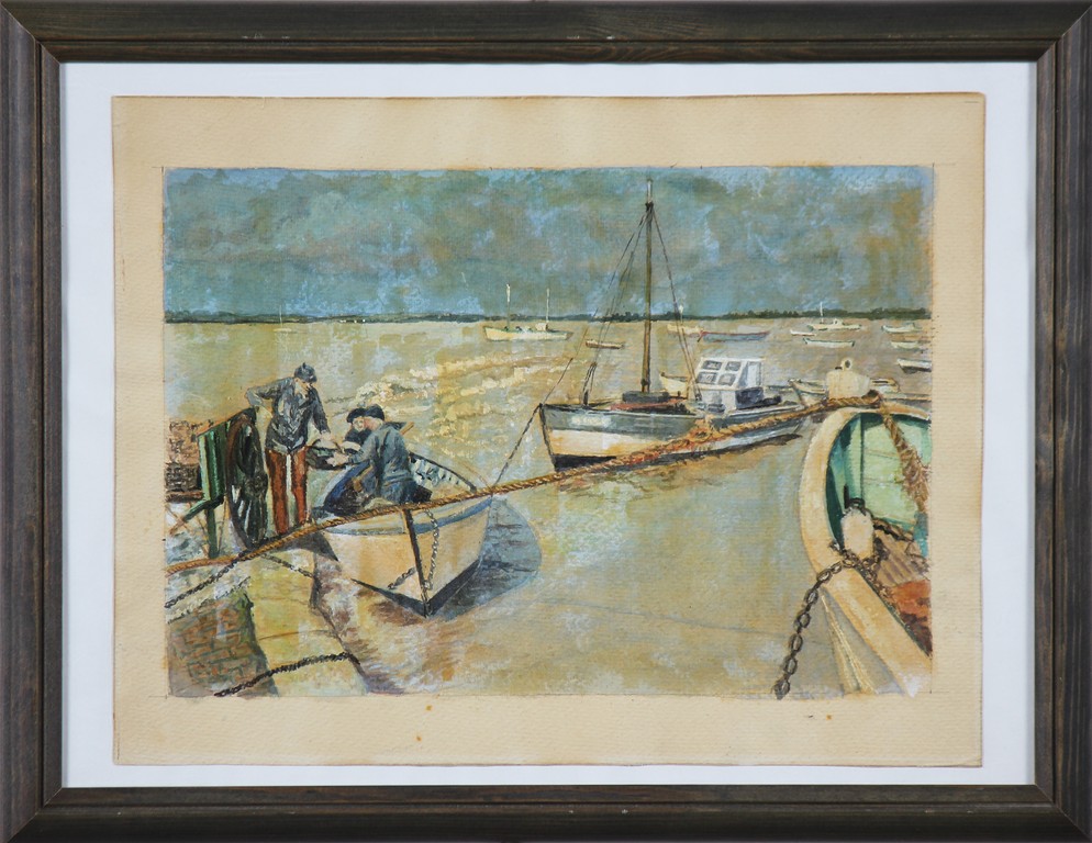 Lot 161 | Barche e pescatori al molo. Pastelli su carta. Cm 20,00 x 35,00. . Cornice...