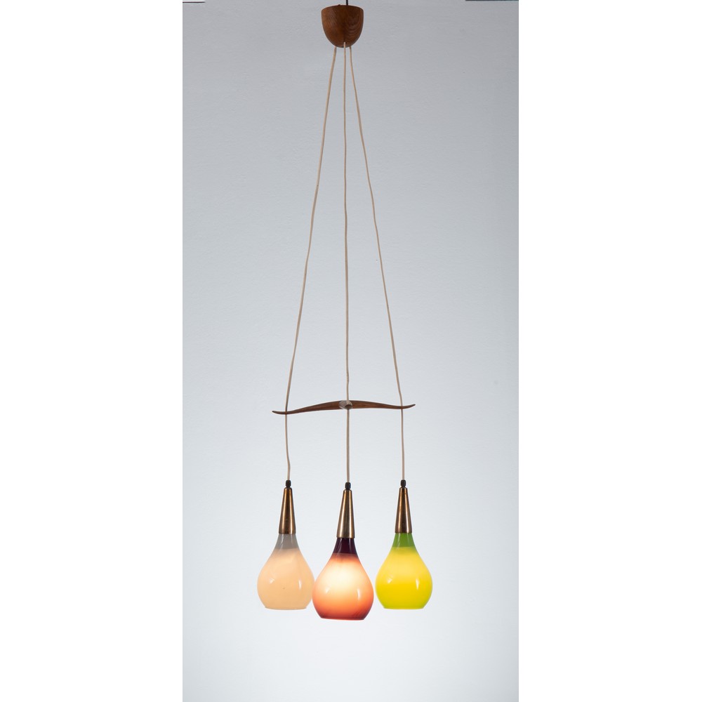 Lampada a sospensione a tre luci, struttura in legno tripartita da cui pendono tre diffusori in vetro a goccia uno nei toni del bianco, uno verde e uno viola, finiture in ottone.