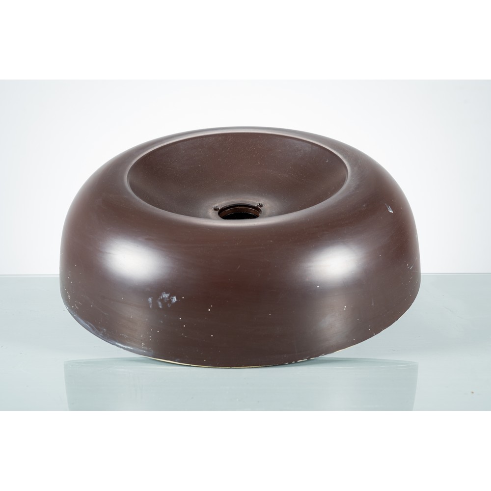 Lampada da soffitto ad una luce in metallo verniciato marone, corpo circolare semisferico. Segni del tempo.