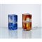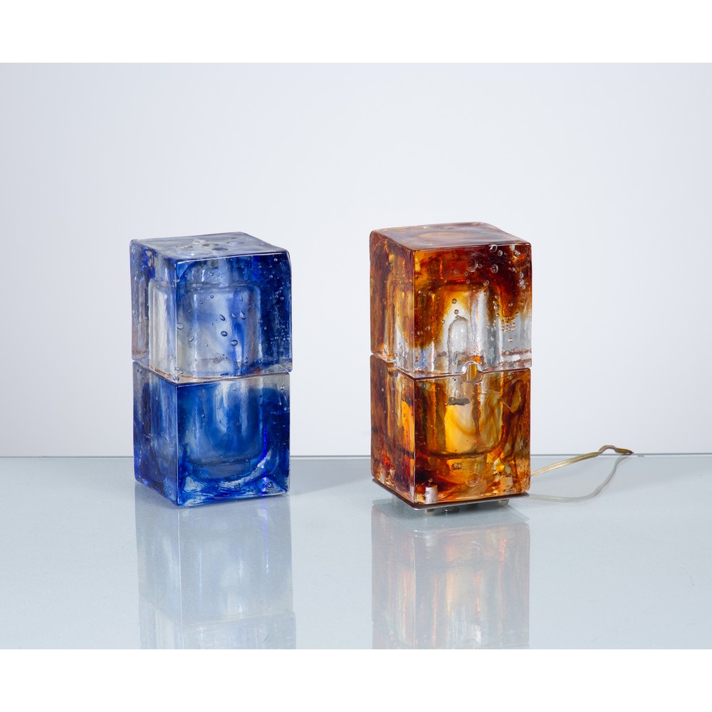 Due lampade da tavolo ad una luce in vetro di murano composte da due cubi sovrapposti in vetro sommerso, una lampada nei toni ambra completa di porta lampade, una nei toni blu con forature circolari sovrastanti mancante di portalampade ed impianto elettrico.