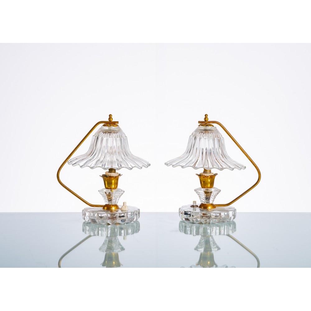 Coppia di lampade da tavolo ad una luce in vetro a costolature trasparente, struttura e giunti in ottone, diffusore a campana, base circolare con elemento di decoro in vetro sfaccettato.