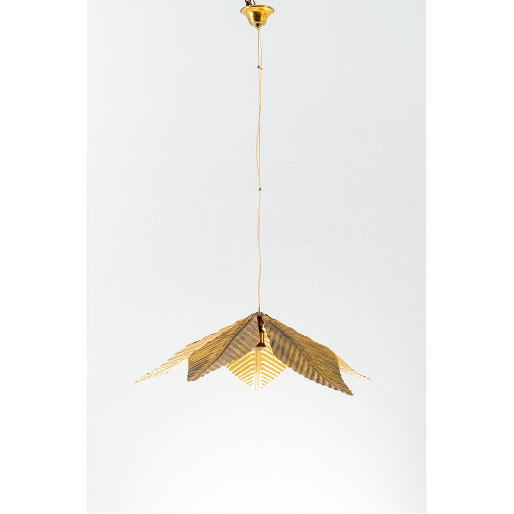 Lampada a sospensione ad una luce, struttura e diffusore composto da foglie in ottone lucido.