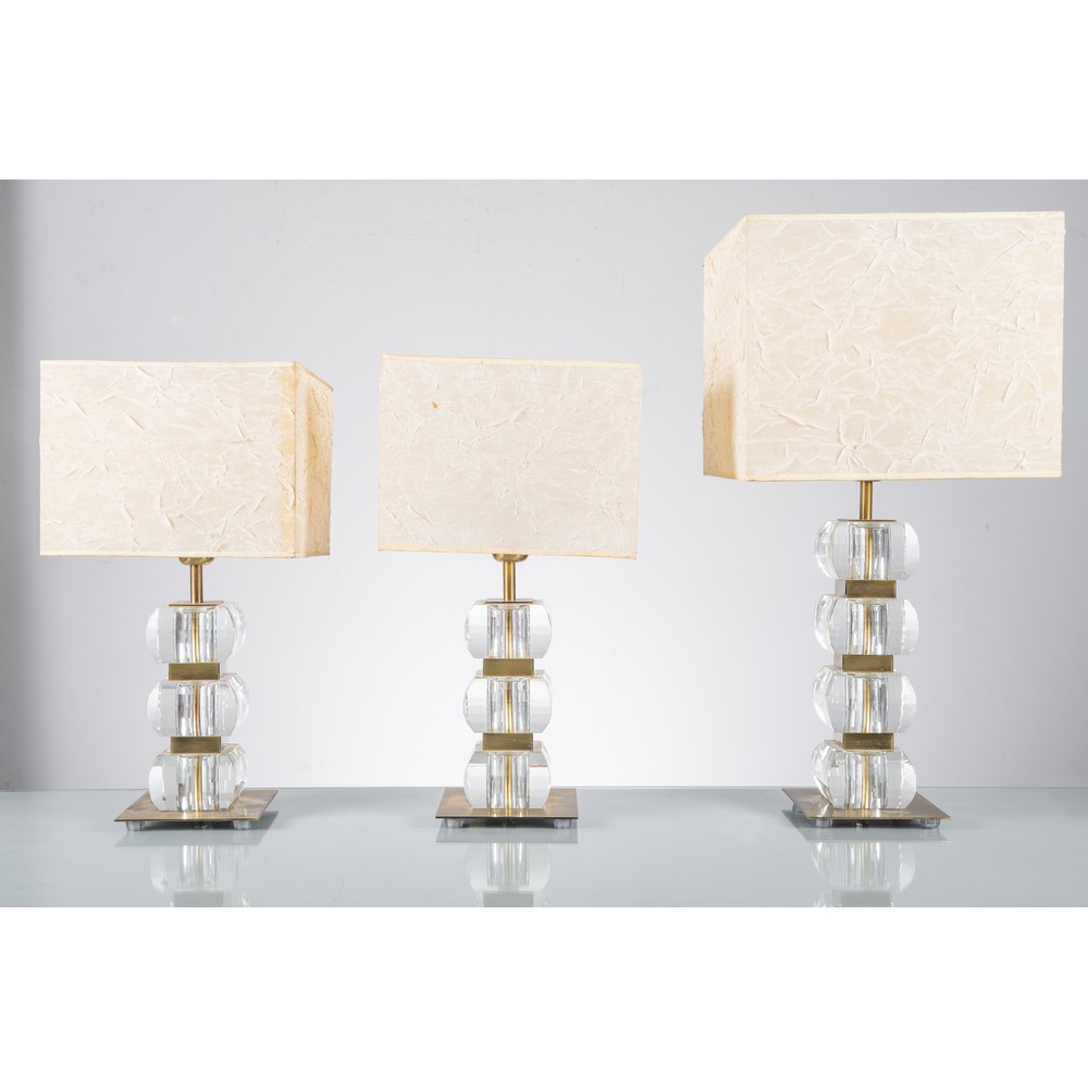 Trittico di lampade da tavolo, struttura in ottone con grossi cristalli sfaccettati lungo lo stelo, diffusore in carta, base quadrata. Due lampade della stessa dimensione e una più brande.