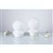 Due lampade da tavolo a due luci una bianca e una blu, diffusore a clessidra in vetro lattimo, base circolare in metallo verniciato bianco. Illuminazione con dimmer.