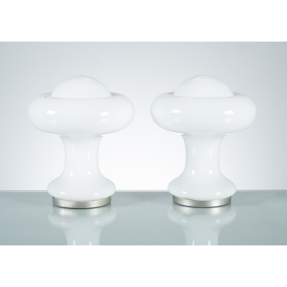 Coppia di lampade da tavolo ad una luce modello “Mushroom” in vetro lattimo, corpo unico cilindrico con diffusore semisferico. Base circolare in metallo cromato
