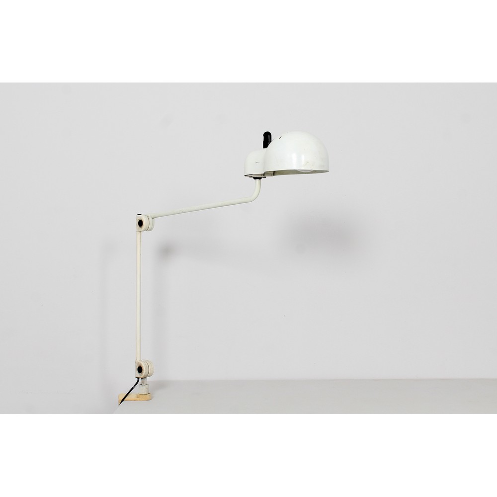 Lampada da tavolo ad una luce modello “Topo”, diffusore semisferico in metallo verniciato bianco, braccio in acciaio snodabile, base tonda in plastica nera. Un graffio sul diffusore.