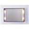 Specchio da parete in cristallo specchiato, corpo rettangolare, cornice in vetro blu, illuminazione laterale a quattro luci con diffusore curvato lattimo.