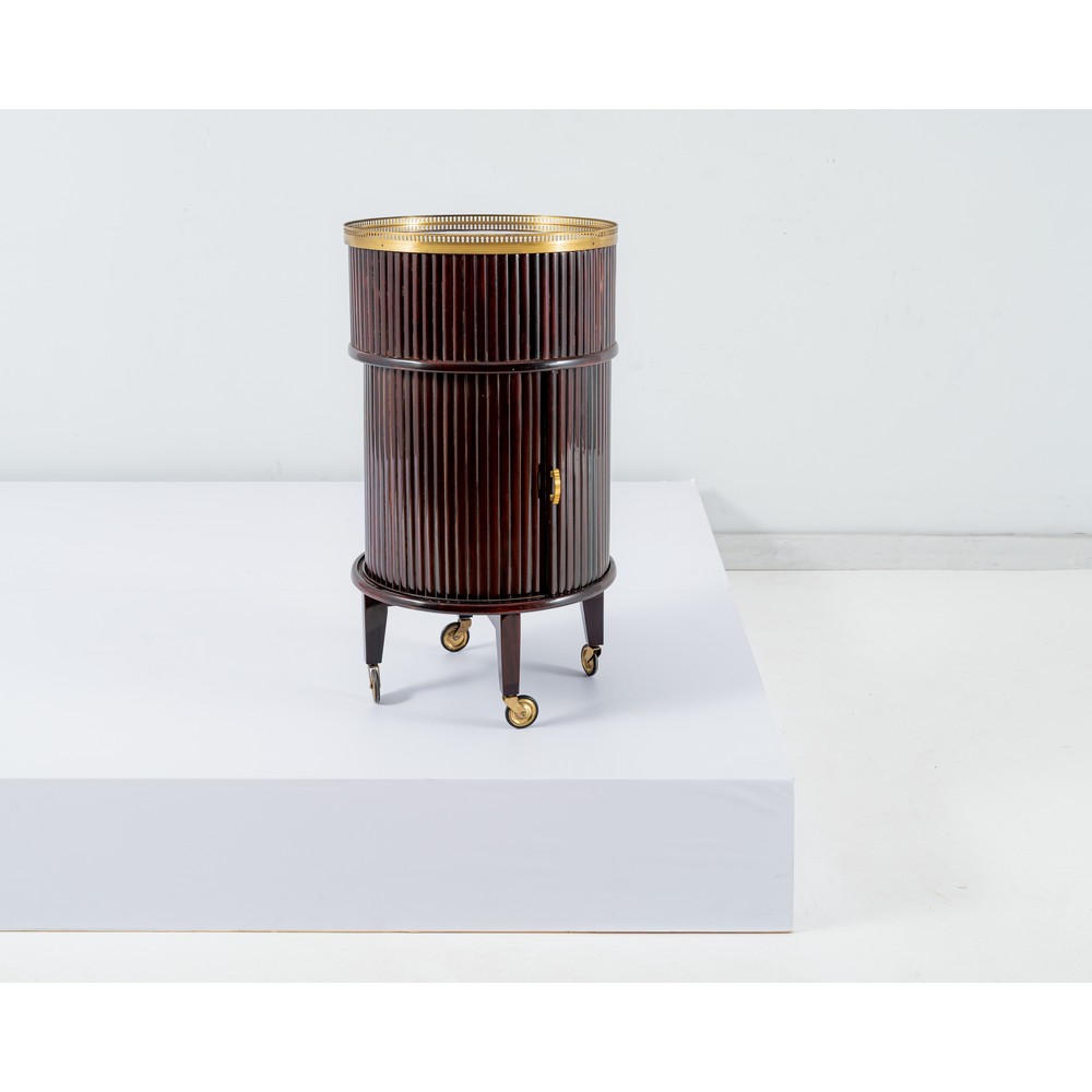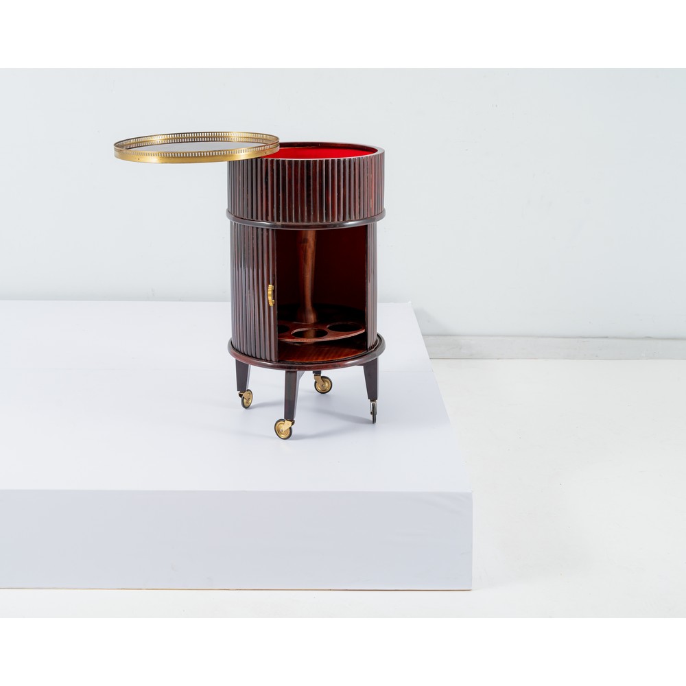 Carrello bar in legno di mogano, corpo a cilindro scannelato, vassoio rotante con ringhiera in ottone traforato, vano sottostante, anta scorrevole con vano portabottiglie (sei), ruote e accessori in ottone.