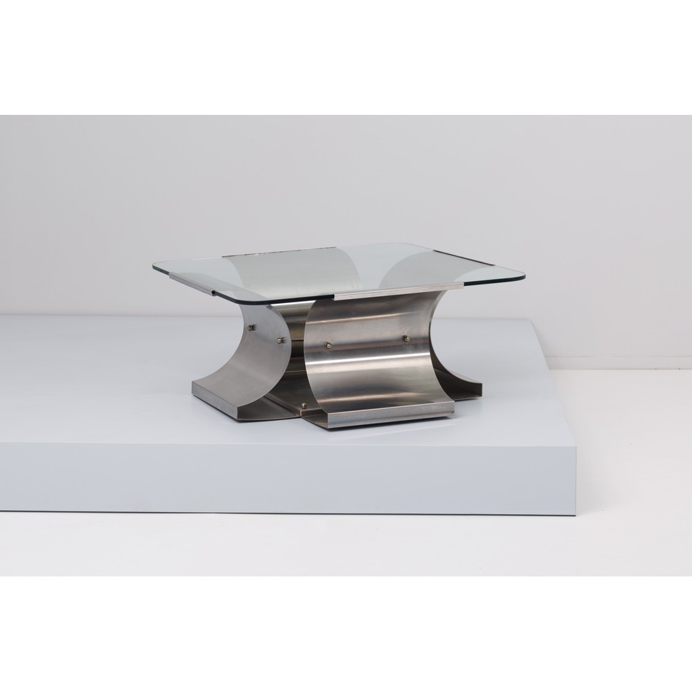 Tavolo basso struttura in lastre d'acciaio curvate, piano rettangolare in vetro di grosso spessore, inserti metallici di giuntura tra le varie lastre d’acciaio.