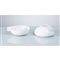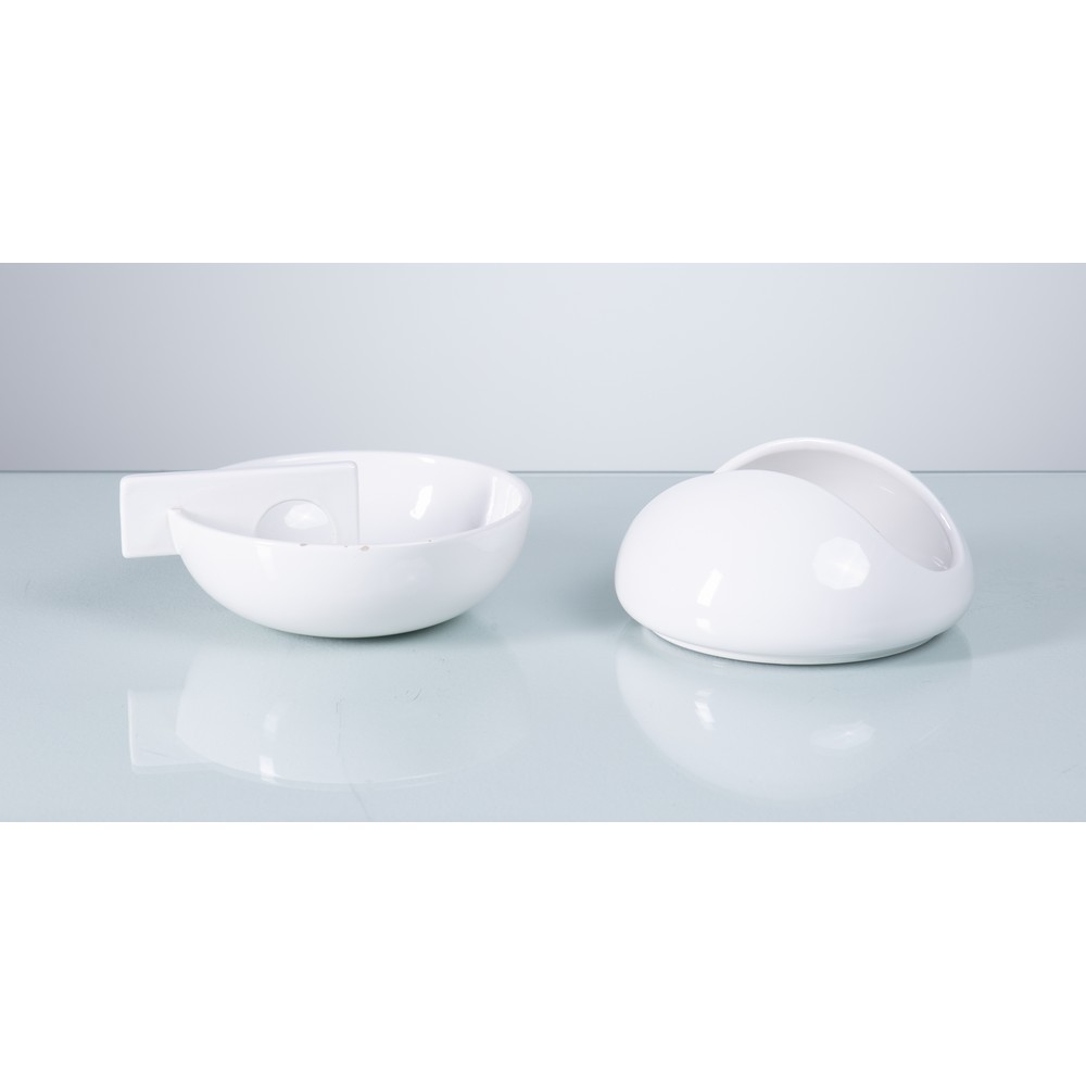 Due ceramiche da tavolo smaltate bianche con corpo semisferico, una decorata con un elemento separatore forato, una con fascia ascendente. Firma sottostante "Il Picchio". Lievi difetti sul bordo.