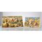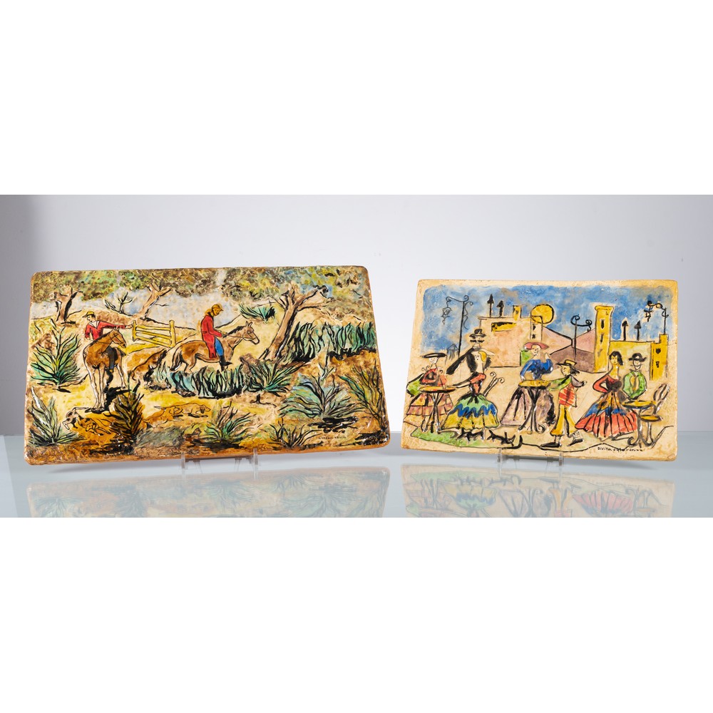 Due formelle rettangolari in compensato e gesso dipinto in policromie, una raffigurante una scena di campagna, una raffigurante una scena di figure sedute ai tavoli di un caffè.