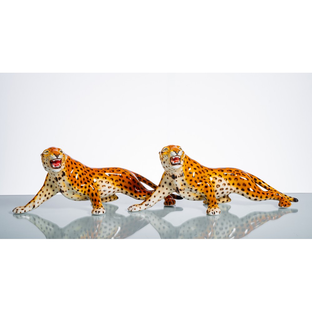 Due leopardi in ceramica smaltata e decorata in policromia.
