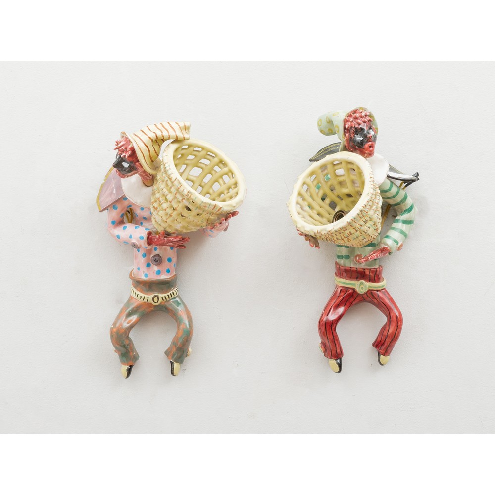 Coppia di lampade da parete ad una luce in ceramica smaltata policroma, raffigurante due personaggi carnevaleschi. Incollatura e mancanze.