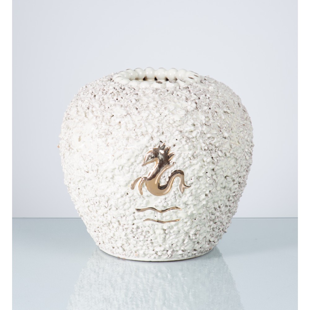 Vaso in ceramica bianca a lavorazione pizzicata, corpo globulare con decoro centrale con figura marina, bocca circolare piana decorata con perlinatura, base circolare. Firma alla base.