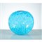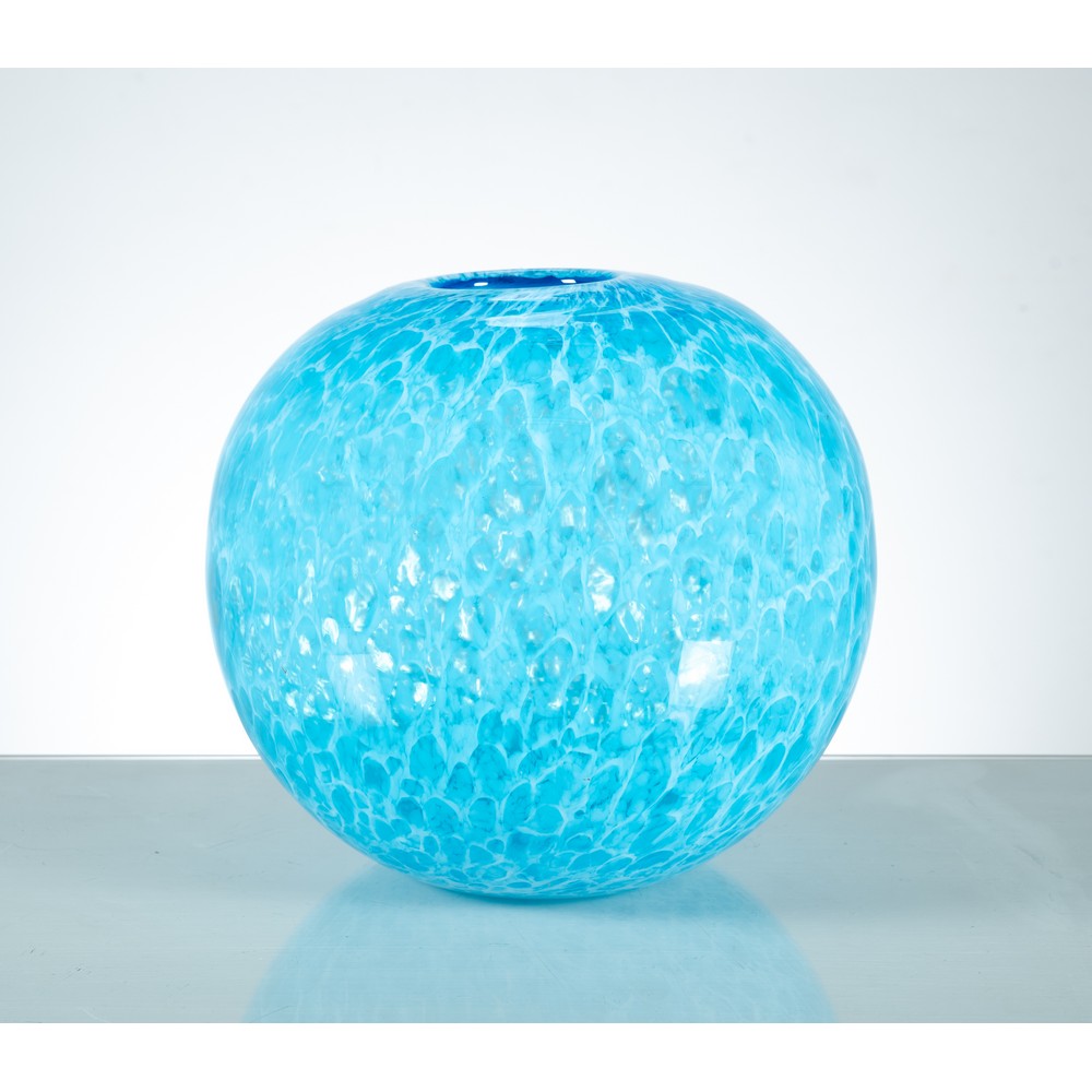 Vaso in vetro soffiato nei toni del turchese con retinatura lattima, corpo globulare con bocca piana circolare.