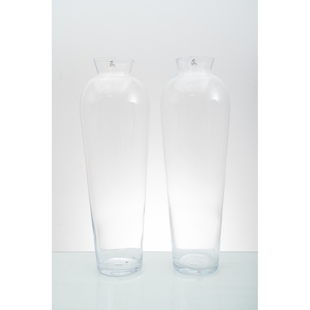 Coppia di grandi vasi in vetro trasparente, corpo ovalizzato, collo basso a vaso, bocca circolare. Sbeccatura. Etichetta di produzione. Sbeccatura.