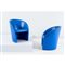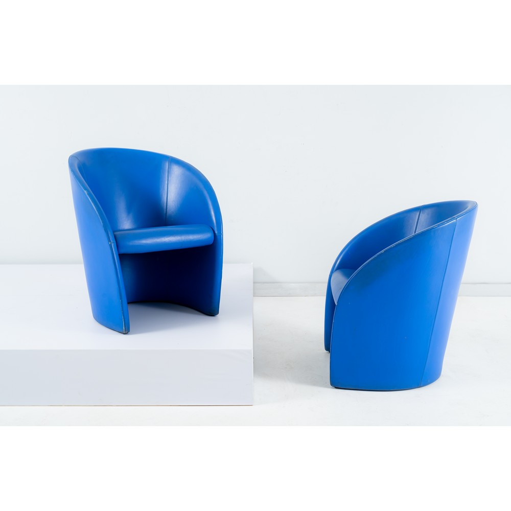 Coppia di poltrone modello “Intervista” con struttura in legno imbottito e rivestito con pelle blu. Marchio di produzione. Difetti.