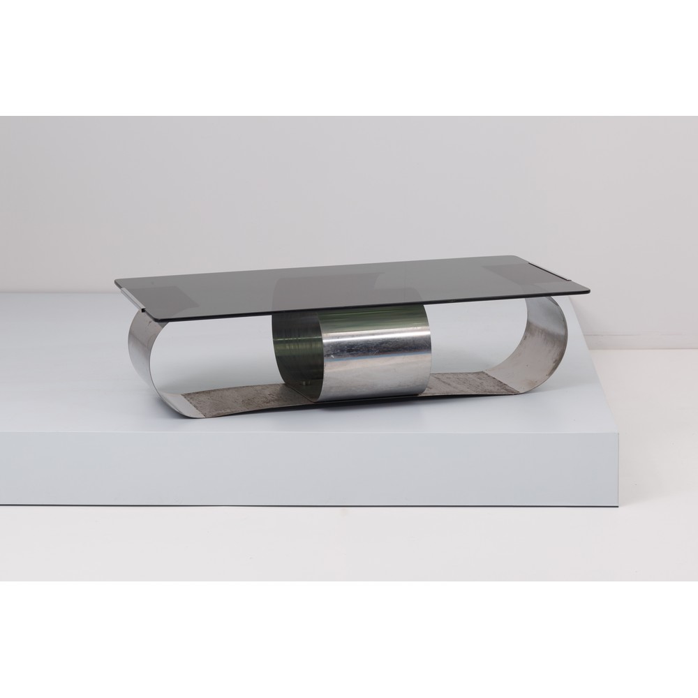 Tavolo basso, struttura in lamina d'acciaio curvato, piano rettangolare in vetro fumé con angoli smussati. Segni di usura.