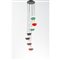 Lampada a sospensione a sette luci, diffusori geometrici di differente colore in vetro-acrilico bianco, verde, rosso, arancione e fumè. Struttura superiore circolare in metallo verniciato nero.