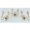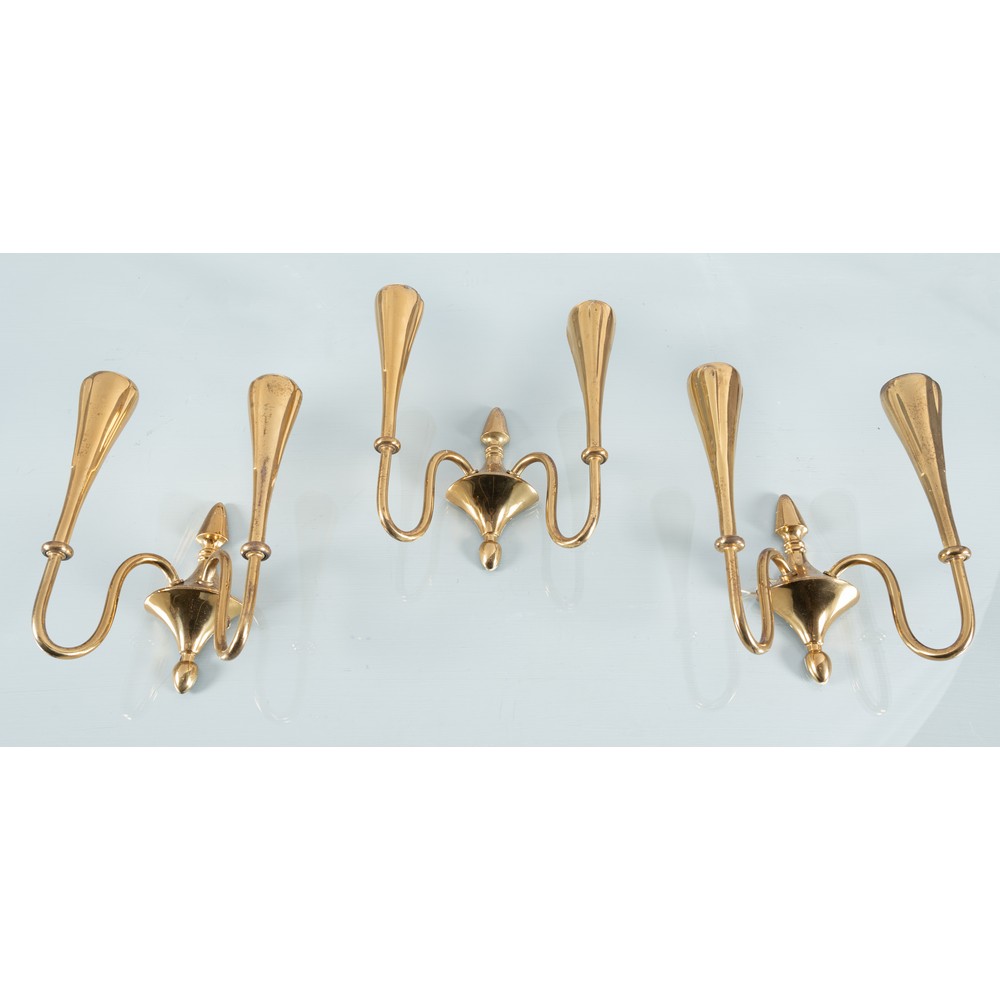 Tre lampade da parete a due luci, struttura in ottone con diffusori conici su bracci ricurvi.
