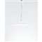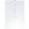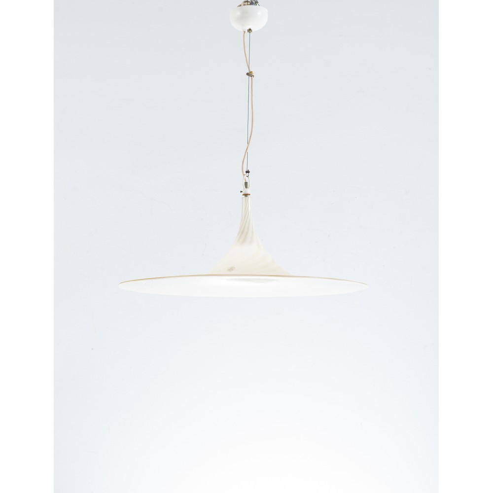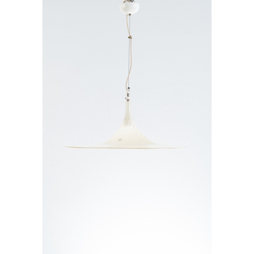 Una lampada a sospensione ad una luce in vetro lattimo con decoro a spirale, diffusore a tromba con cappello circolare.