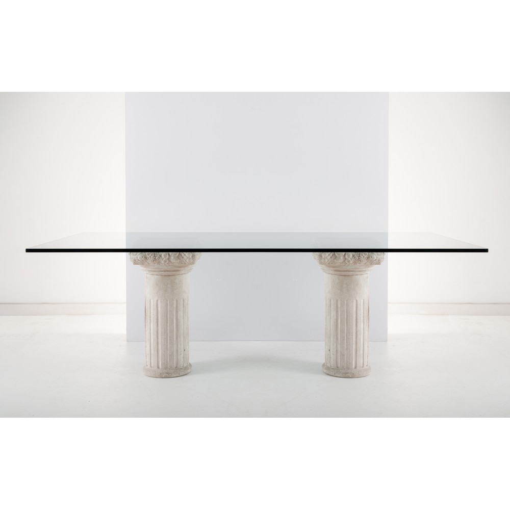Tavolo da pranzo realizzato con due capitelli su colonna, piano rettangolare in cristallo di grosso spessore. Sbeccatura nel piano.