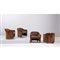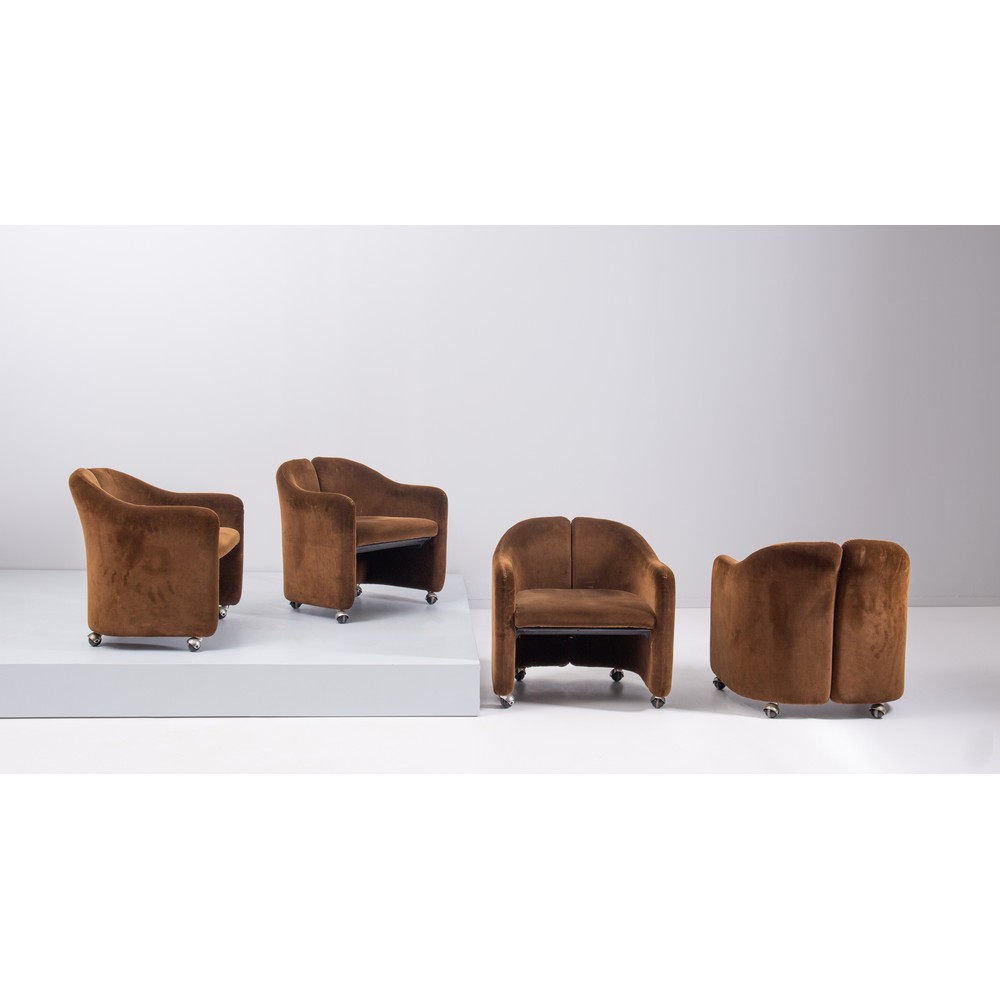 Quattro poltrone su rotelle modello "P142", struttura in legno con imbottitura e rivestimento in tessuto color marrone.