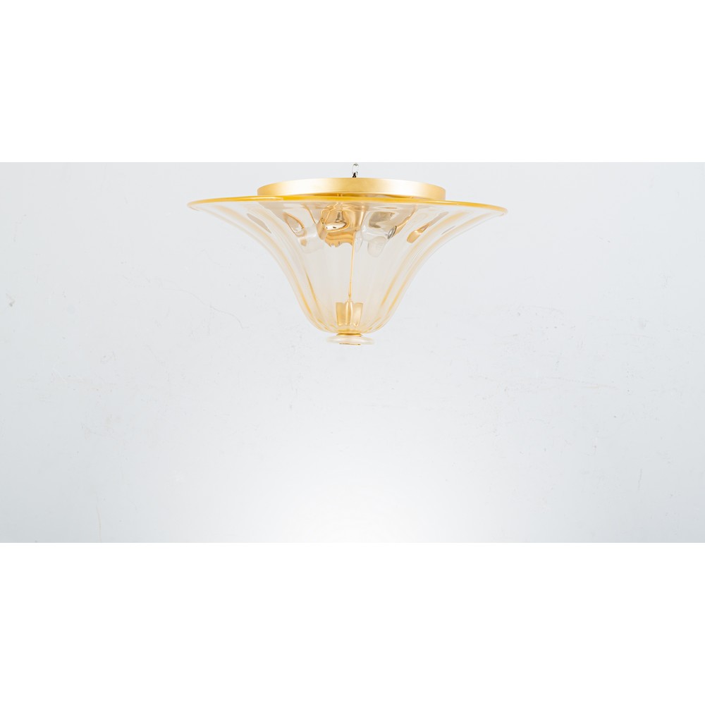 Lampada da soffitto 3 luci in vetro pagliesco con bordo dorato, corpo a campana rovescia struttura in metallo dorato.