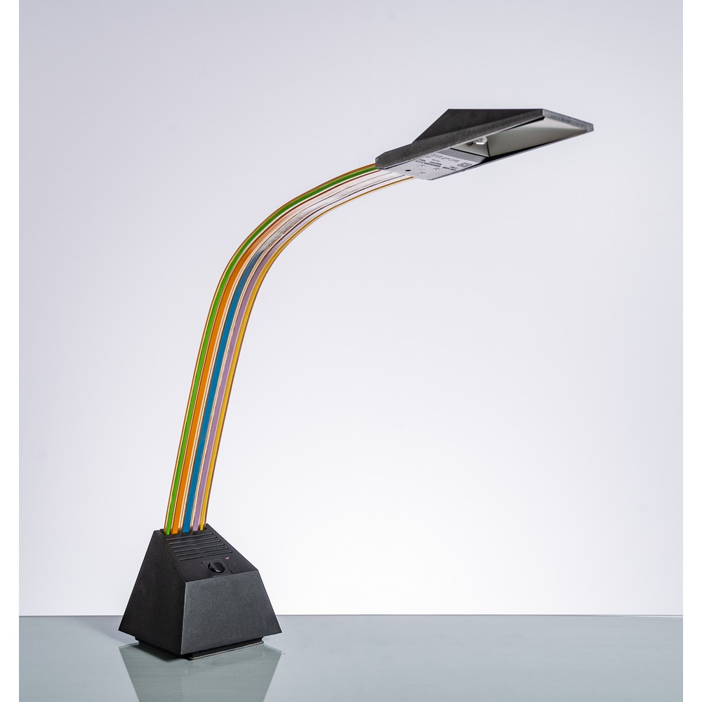 Lampada da tavolo ad una luce modello “Nastro”, braccio e base in metacrilato e gomma. Marchio di produzione.