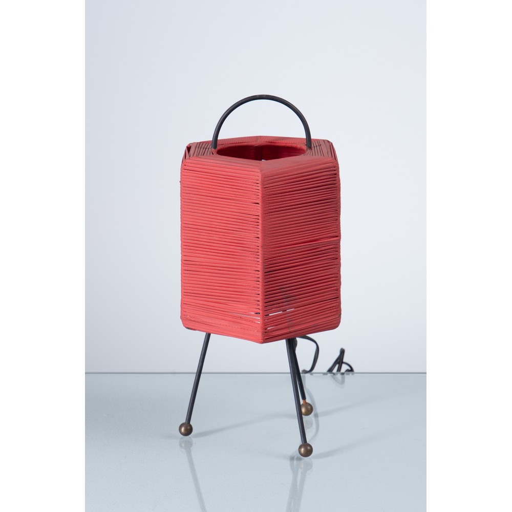 Lampada da tavolo ad una luce nello stile di Isamu Noguchi, struttura in tubolare metallico verniciato nero, diffusore esagonale in tubolare plastico nei toni del rosso.