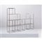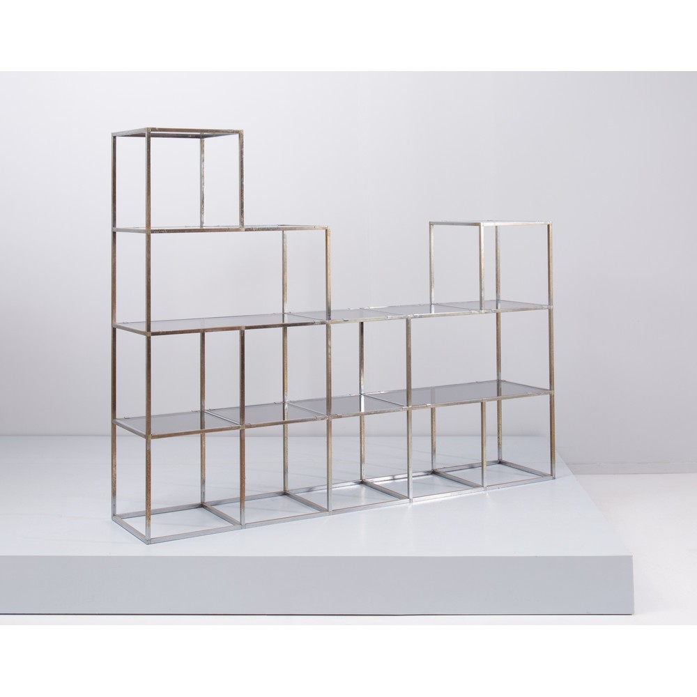 Libreria a giorno con struttura in acciaio e piani in vetro, vani quadrati e rettangolari.