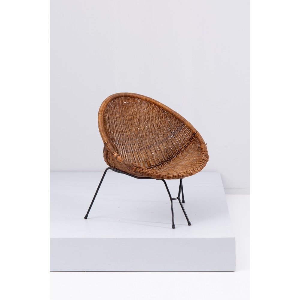 Poltrona con struttura in metallo tubolare verniciato nero, seduta e spalliera in giunco, vimini e malacca.