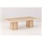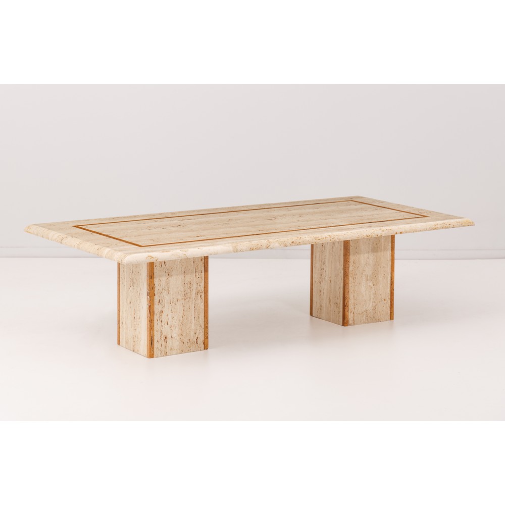Tavolo basso interamente in travertino, piano rettangolare bordato con fascia in marmo rosso, due piedi a parallelepipedo.