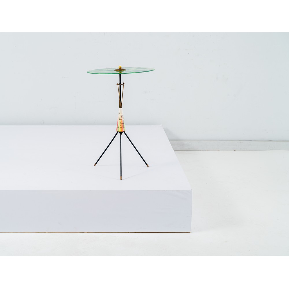Piccolo tavolo con struttura in tubolare di ferro verniciato nero, piede tripode con elemento di decoro centrale in ceramica dipinta rosa, gialla e verde e decorata con motivi astratti neri, base in vetro marmorizzato e decorato con elemento in ottone. Difetti.
